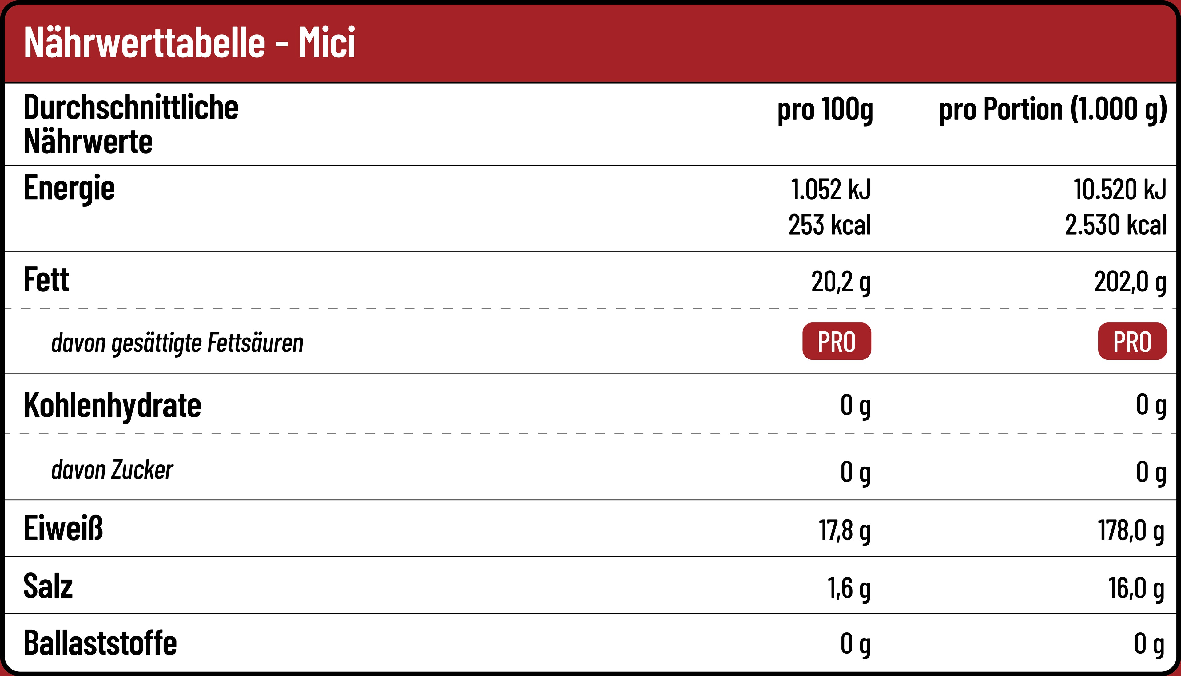Nährwerttabelle unserer Mici - Mit Sorgfalt hergestellt und von unseren Kunden bedingungslos geliebt.